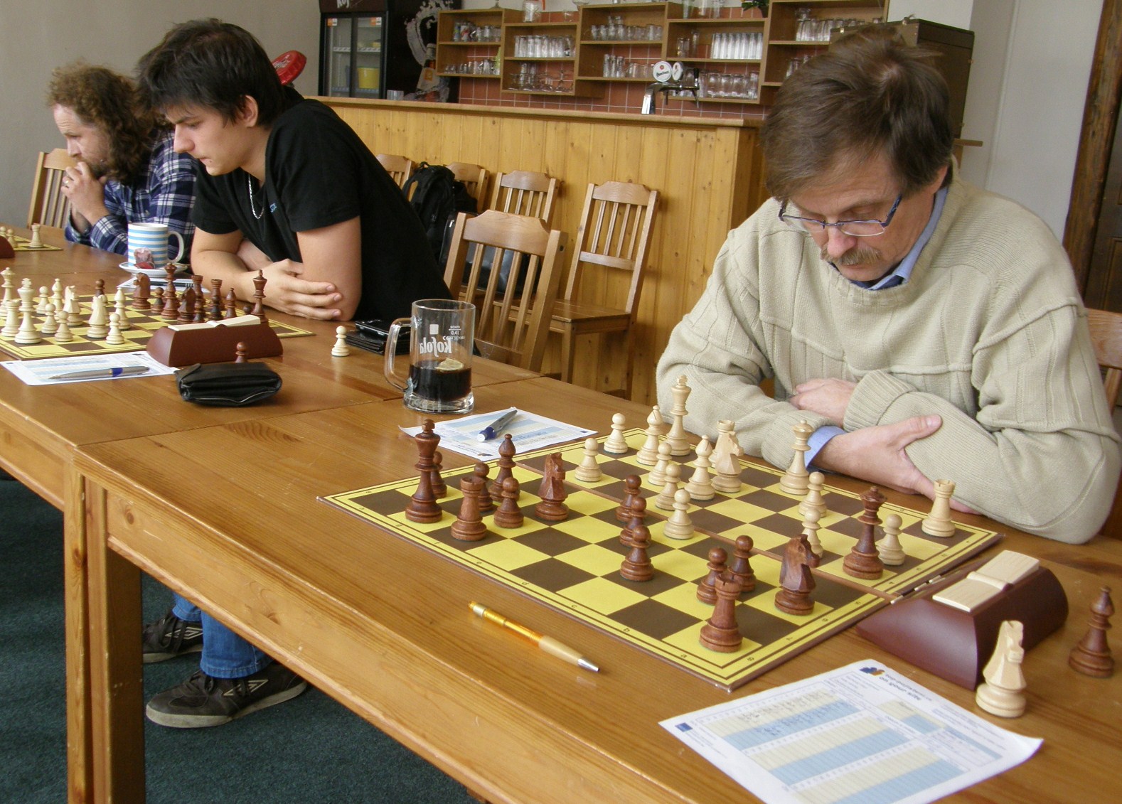 Kameník – Pečinka: jedním okem jsem kontroloval, že Martin stojí černýma líp; pak jsem viděl, že získal ph3; pak najednou bílé figury ožily a s několika minutama řešit valící se taktické hrozby asi nešlo. Po uspěchaném braní kvality Jxd8? ale Martin udržel.1/2