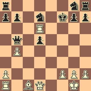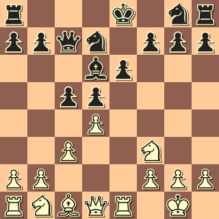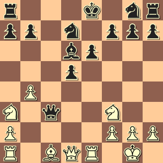A tady to přijde: 13. Jb5!! Ve stylu romantiků 19. století. 13. … Dxa1? Nechává si to ukázat. Po asi nejlepším 13. … Dxb4 přijde skryté 14. a4! s ideou Sa3. Krásně bílému vychází 13. … Dc6? 14. Jfd4 Db6 15. Jxe6 fxe6 16. Vxe6+ Kf7 17. Vxd6 Dxb5
