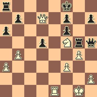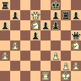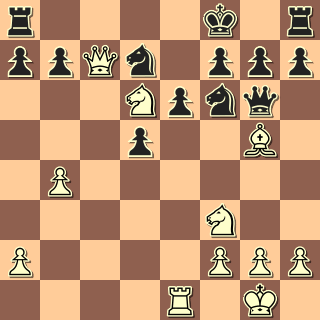 23. Jdf5!!? Stačí, byť ještě přísnější bylo 23. Jhf5!! 23. … Vg5?! Snad jedině Dg5, věž tam nechat. 24. g4 A to je konec, černá dáma ještě není ke braní, ale po Kh1 už bude; s tím se nic nenadělá. 24. … exf5 Rezignace. 25. Jxf5