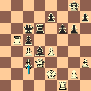 34. … Sxc3! Hrdina černých polí padá v boji. 35. Dxc3? Nechává si to tedy ukázat. Jinak by ovšem černý definitivně získal pole d4 pro střelce nebo pro věž, mohl by podle okolností proniknout na druhou řadu nebo pokračovat v tlaku proti pe4. 35. … Dxe4+ 36. Kf2 Na 36. De3 vychází Dxc4+. Po partii se soupeř ptal, jestli neměl vložit šach věží, aby nevisela, tedy 35. Vb8+ Kg7 36. Dxc3 Dxe4+ 37. De3. Pak by ale přišlo 37. … Dc2+ 38. Kf3 Vd3.