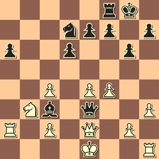 Následovala manévrovací fáze partie, kterou ani jeden z nás nehrál zcela přesně. Připomeňme ovšem, že se hrálo kavárenským tempem 90 minut na partii + 30 s za tah, tedy bez další periody po čtyřicátém tahu. K tomu bylo třeba obcházet a sledovat žákovské partie, takže analytickou přesnost od mé hry raději nečekejte.