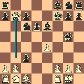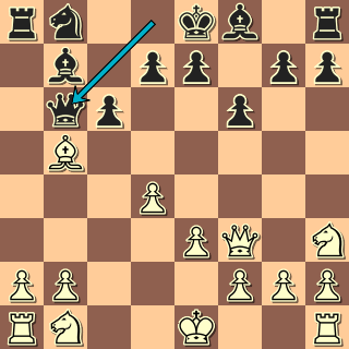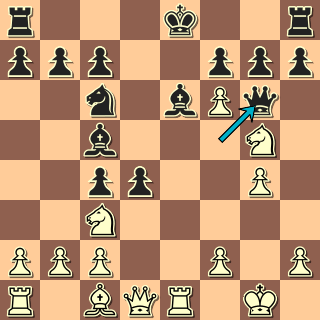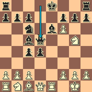 Někoho by třeba nenapadlo přerušit svému střelci diagonálu; podstatné však je otevření dráhy dámy k poli a5. Po ústupu bílého střelce přijde typická vidle Da5+. Bílý sice viděl šance spojené s útokem na f7 i na b7, místo správného 9. Db3!  si ale vybral 9. Df3??. Problém je, že po 9. … f6 10. Jh3 Db6!