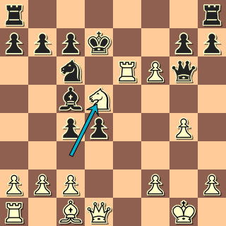 Ani ne tak ústup koně (ten napaden nebyl), jako spíš krytí věže. Asi nejlepší je teď 14. … Df7 se složitým bojem; černý má rozhodně dobré šance. 14. … Kxe6?? Ani to nebyla oběť, ale obyčejné přehlédnutí. Očekával černý 15. Jxc7+? 15. Jf4+ Kxf6 16. Jxg6 Kxg6 17. Df3!