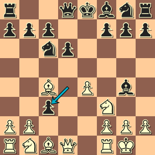 (nic nedává 10. … Da5+ 11. Jc3) je napaden Sb5 dámou i pěšcem (dáma kryje Sb7) a po jeho ústupu padá b2 a a1. 11. Sc4 Dxb2 12. 0-0 Dxa1 atd. už bylo zbytečné 0:1