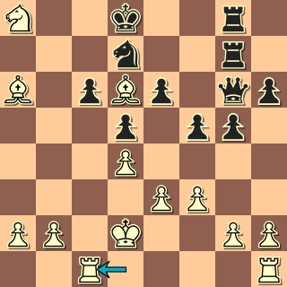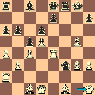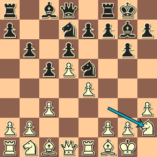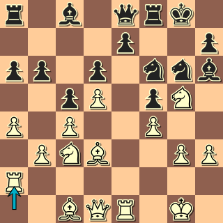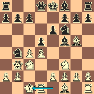 Tady hrozí f4, mohl jsem ale hrát gambitově 11. … c4! 12. f4 Jd3 13. Sxd3 cxd3 14. Dxd3 Jc5, kde figurky hrajou. To mě nenapadlo a po 11. … f5?! 12. f4 Jf7 13. exf5 gxf5 jsem se dostal do pozice dost nepohodlné. Převaloval jsem figurky, ztrácel jsem čas, kýžený protiútok ne a ne vycházet, až s deseti minutama jsem se k němu dostal:
