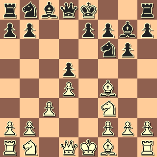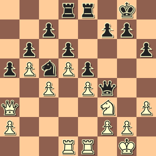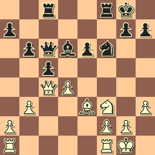 To bylo očividné, ale oba jsme teprve nyní postupně zjišťovali, jak silný je to vlastně tah. Nejdřív jsem viděl, že je v ohrožení Sd3 (hrozba dxc3). Postupně jsem ale uviděl i hrozby Dh4, Dg5, Dd5, Sxg2, Sf3 … zapomněl jsem na nějakou? Například jsem byl vcelku spokojen s tahem 16. Sb5, než jsem si uvědomil, že tím přímo provokuju Sxg2! Strávil jsem přemýšlením 36 minut a našel zřejmě nejlepší 16. Ve1. Je to s tempem (napadá střelce), uvolňuje pole f1 pro střelce i pro krále. Teď se zase na 35 minut zamyslela soupeřka. 16. … Ve8?! To jsem považoval za nejlepší, comp ukazuje nenápadné 16. … Df6!, věž totiž přestala krýt f2, takže po 17.cxd4 přijde Sxd4. 17. cxd4 Naštěstí teď dáma kryje věž, čímž tlumí hrozbu Sxh2+. Partie teď skončila velmi náhle. 17. … Sxh2+?! 18. Kxh2 Dh4+ 19. Kg1 Sxg2! 20. Kxg2 Dg4+ remis. Po té hrůze, která se mě zmocnila po 15. … d4, ještě zlatá půlka.