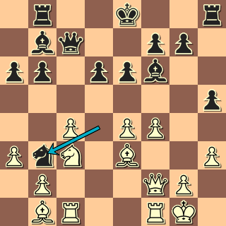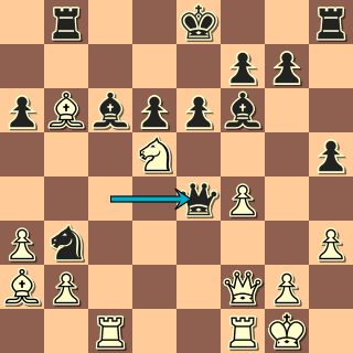 22. … Sc6! Podstatná je hrozba 23. … Vxb6 24. Dxb6 Sd4+. Jinam (např. Sxe4) mi ústup střelce nevycházel. Mj. překrývá sloupec věži, aby nebyl na c8 někdy šach. 23. Jd5!? To jsem čekal, ještě lepší však bylo 23. e5! 23. … Dxe4
