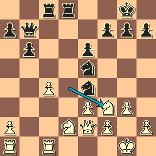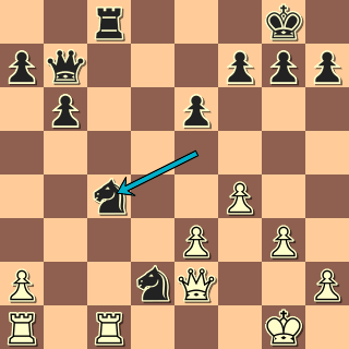 Na 18. … Jxd2 jde 19. Jxe5, vychází však 18. … Vxd2! 19. Jxd2 Jxd2 20. f4 a teď jsem si místo šachu na f3, který jsem nějak nemohl dopočítat, vybral 20. … J5xc4?!