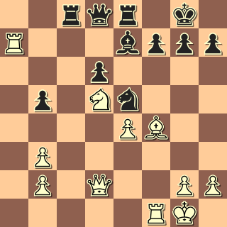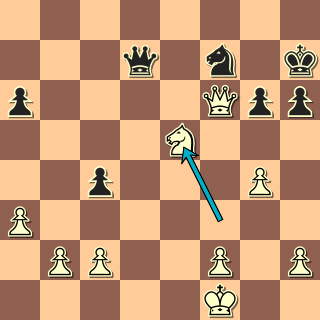 Zrovna jsem zašel do sálu na obhlídku a tam se na mě smála tahle pozice. Jd5 mocně ovládá šachovnici – a co víc, bílý tu přímo získává figuru! 1. Sxe5 dxe5 2. Jxe7+ (2. … Vxe7? 3. Dxd8+ Vxd8 4. Vxe7) Jirka myslel, od partie jsem odešel dřív, než táhl – a s údivem jsem se později dozvěděl, že prohrál; co se to stalo? Škoda šance.