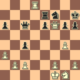 Naše hráčka má pika a hlavně aktivní těžké figury, jasná výhoda. Jen nepustit dámu k nějakým věčňákům. 1. … Dc7 2. Vd4?! Lépe 2. Vf8!, věž na osmé řadě je poklad. 2. … Vd7?! Pochopitelná snaha měnit pasívní věž za aktivní, ale pouští pe6. 3. Jf3! Poslední bílá figura zasahuje do hry. 3. … e5! Zajímavá léčka, jen ji dotáhnout. 4. Vxd7 Dxd7 5. Jxe5?