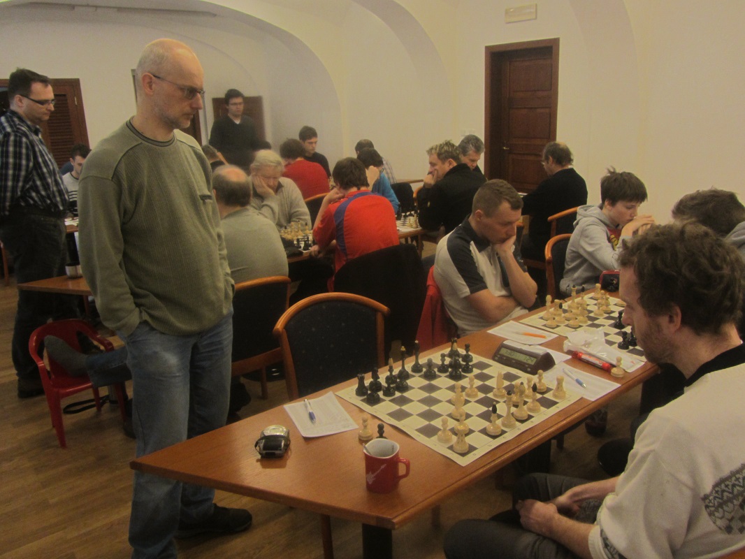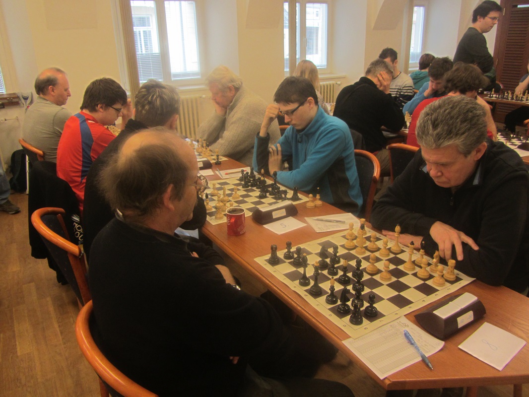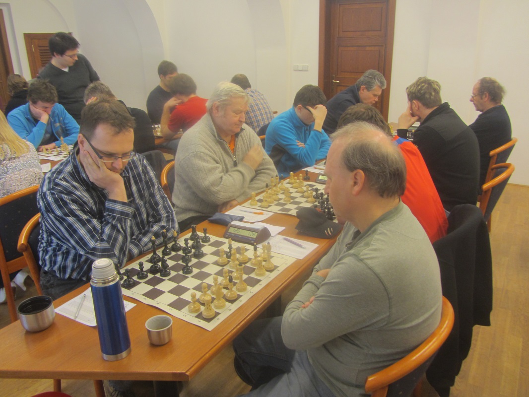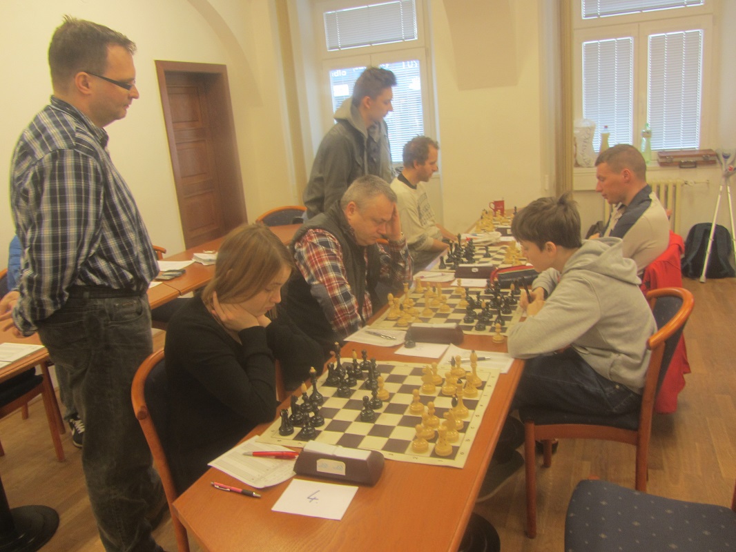 Tak tři hodiny boj, pak se začalo bilancovat. Michal bohužel záhy zjistil, že jeho soupeř Kožúšek je po MČR rozehranější. 1:0 Jarda zodpovědně myslel až do koncovky, půl. 1,5:0,5 Těsně za sebou prohrál Jenda a Martin P. 3,5:0,5 Hrozící debakl odvrátil Honza. 3,5:1,5