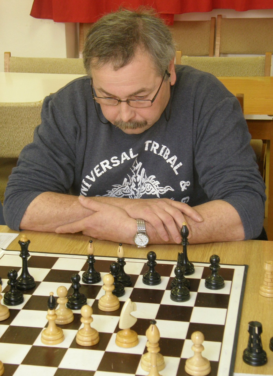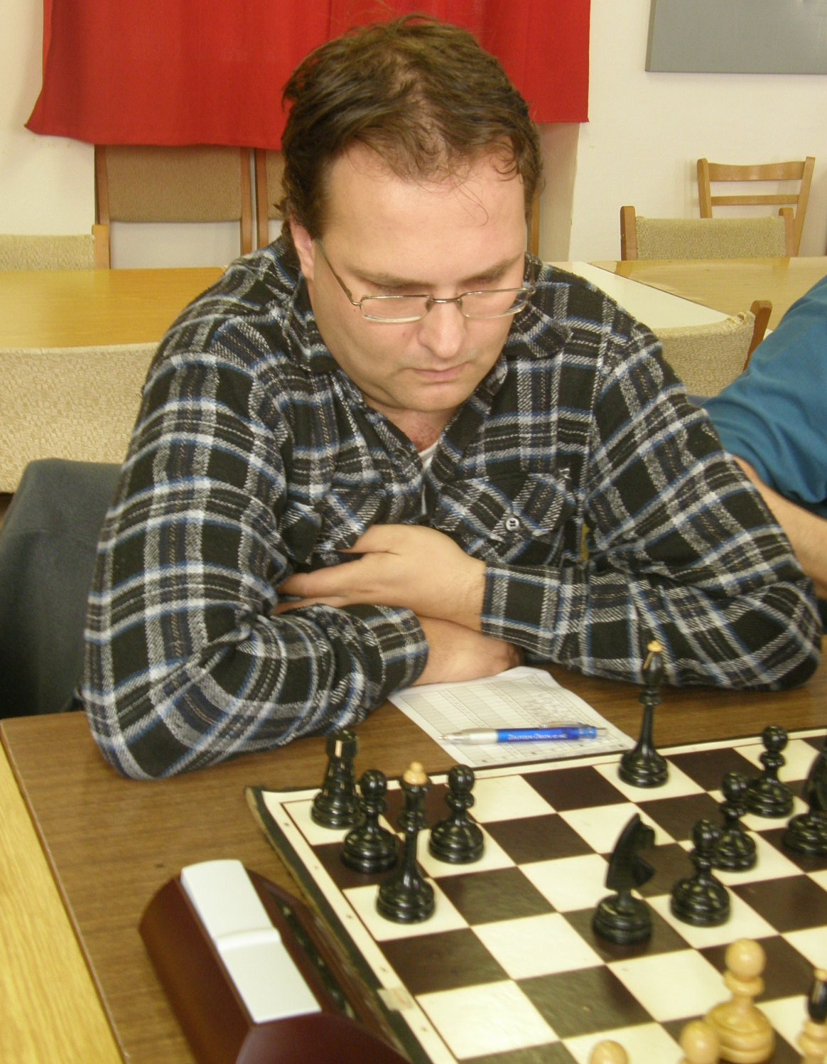 V autě s Petrem diskutujeme, co na zkušeného soupeře. e4 skrzeva soupeřovu znalost teorie zavrhujeme a náš borec nasadí klasickou boudu, kterou na okrese ovládá jak nikdo jiný. Pan Zeman sic reaguje aktivně v centru (pěšci c5, d5, e5), Petr centrum nabourává a hraje se něco vcelku standardního, možná s chlupovou výhodou. Pak nevim… akorát Jarda v hospodě hlásí, že Mr. Zeman v o poznání horší pozici přehlédl jednotažec. Druhá dohraná partie – vedeme 2:0.