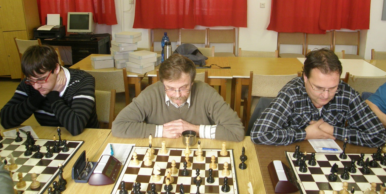 Lucka se dala (možná pod vlivem několika porážek s reportérem 🙂 na „krotké“ d4, Martin, mám ten pocit, v pohodě vyrovnal. A pokud se nemýlím, nabídl remízu. Ta byla odmítnuta (chtělo to vyměnit dámy a zeptat se, jak to bílá míní zkoušet?!), posléze netuším… a následně Jarda hlásí, že Martin stojí blbě (nemohu posoudit). Po obhlídce naše trojka hájí věž a pět floků proti dámě a čtyřem flokům, pozice pevná, leč dekadentní. A výsledek tomu odpovídá… Litomyšl snižuje 3,5 – 1,5.