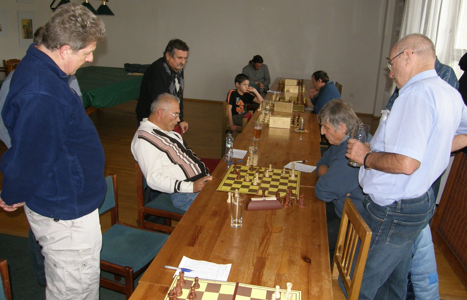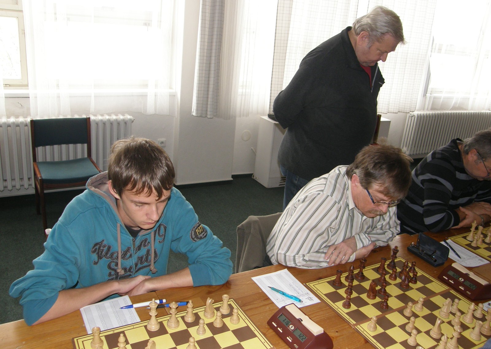 7. Jániš – Hon ½ cosi mezi pirckou a zavřenou sicilkou, kde se mi bílá pozice líbila nejprve více, v dlouhé věžovce čím dál méně. Nakonec Petr musel zachraňovat sice betonově remízovou, nicméně pořád opticky horší věžovku. Hostující hráč to hrál až za hrob, což se v těchto soutěžích tak nějak nedělá. Jestli to chtěl vyhrát silou vůle anebo našeho juniora nějak vystrašit, netuším. V hospodě se ještě teď tlemíme po 101. a posledním tahu 🙂