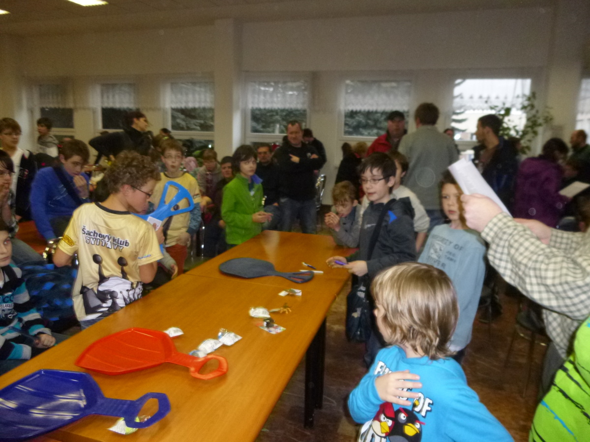 Výhodou jídelny v Rieteru je její velikost, která tu spoustu hráčů s doprovodem pojme, nevýhodou však chybějící prostory pro volné chvíle, kde by bylo možné mluvit, skákat, prostě uvolnit se mezi partiemi. Přesto, že děti nebyly nějak mimořádně neukázněné, panoval tedy v sále téměř neustálý ruch; prostě to byla masová akce, ne seriózní výběrový turnaj.