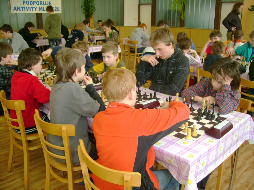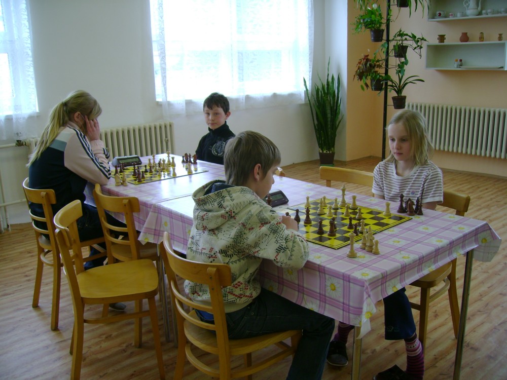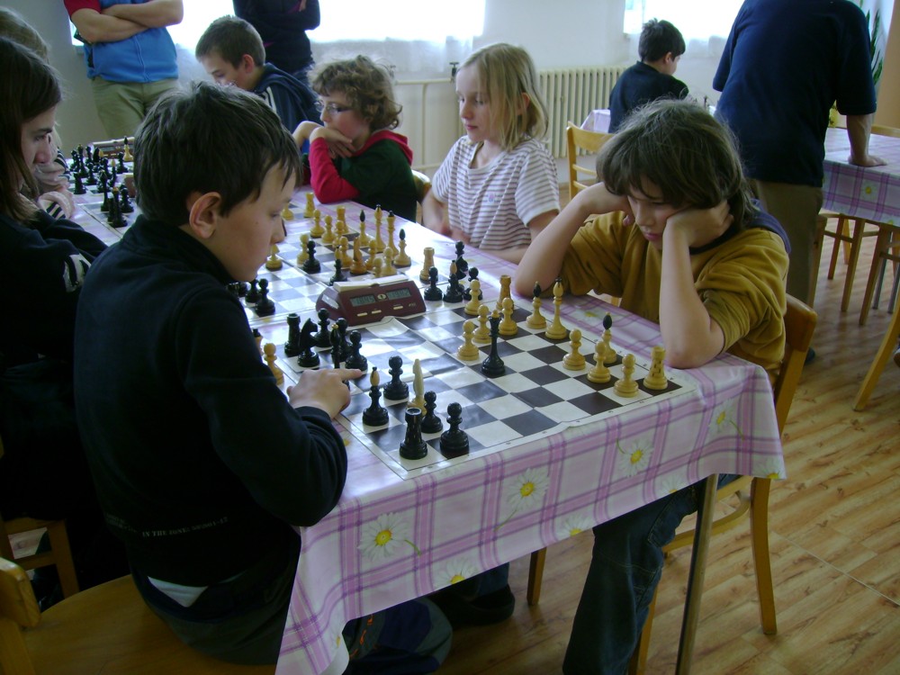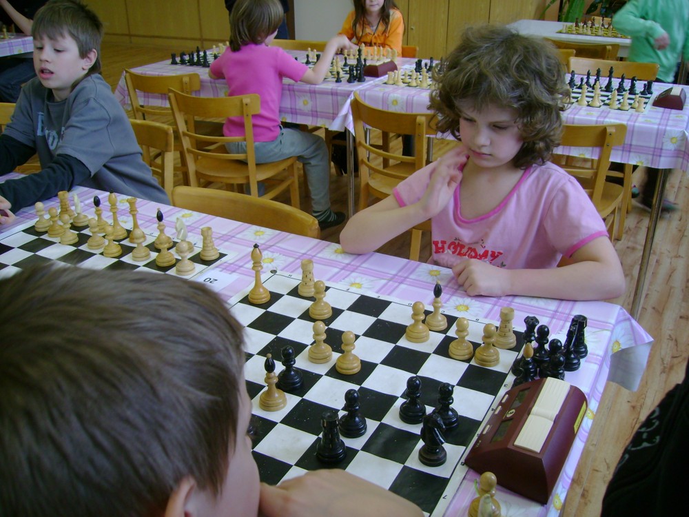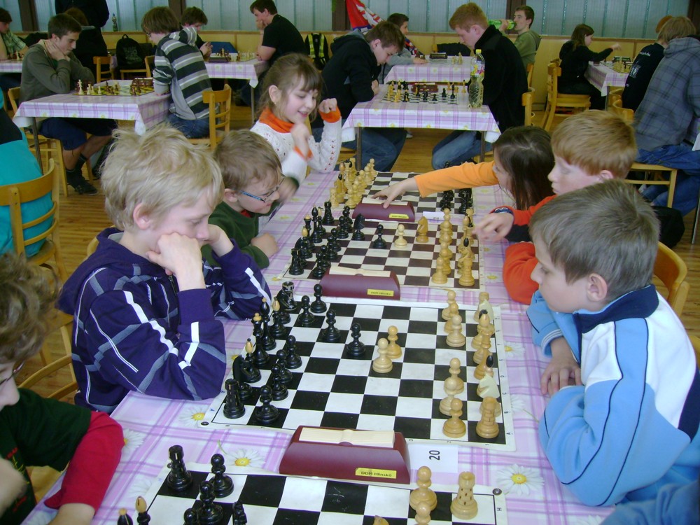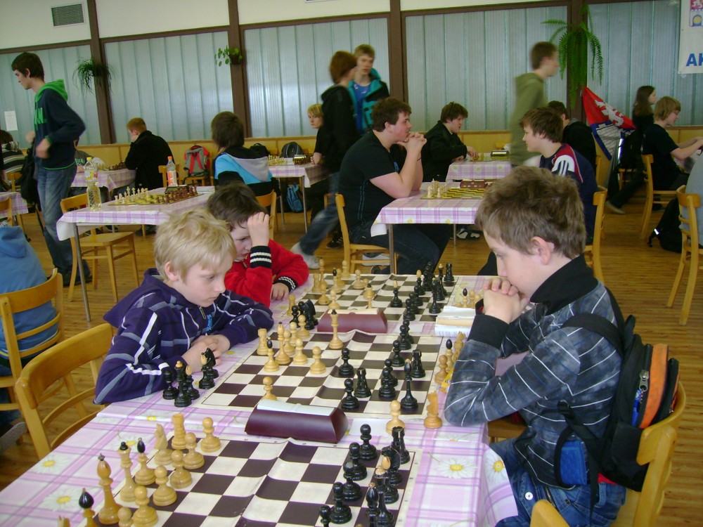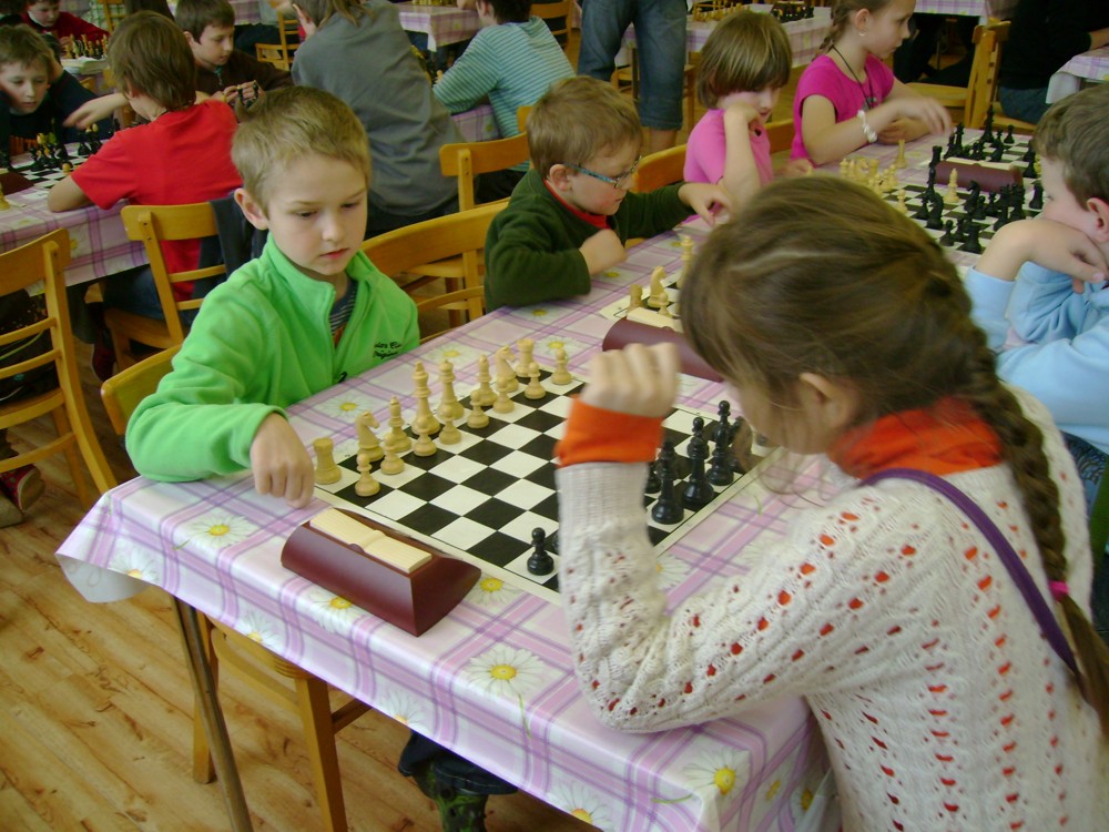 Kateřina Šmajzrová zas tak často nehraje; porážela slabší, půlila s trojkama; prohru si bohužel schovala do posledního kola na druhou šachovnici: o dvě hlavy menší Lukáš Pavlíček ukázal, že obětní Grecovu variantu má narozdíl od Katky nastudovanou. 4,5/7, 10. místo, 2. mezi dívkami, nejlepší z našich, ještě aby ne :-). Vít Holásek hrál svůj solidní standard, moc však nestíhal hrací tempo (ve třetím kole přehrál Dvořáka, ale nebyl schopen zrychlit a spadnul). 4,5/7, 13. místo, dejme tomu. Veronika Šmajzrová po slabším výsledku ze Třebové dala vzpomenout na Orlickou šachovnici. Dařilo se jí, bojovala proti mnohem větším klukům, blýskla se výhrou nad Lukášem Paukertem. 4,5/7, 14. místo, 3. mezi dívkami, v tomto případě rozhodně úspěch! Martin Paukert už nehrál ani nepamatuju, tady se po startu 1/3 zvedl, vyhrál pak třikrát v řadě, mj. nad Monikou Ryšavou a předstihl mnoho našich zkušenějších hráčů (včetně staršího bráchy). 4/7, 18. místo. Vašek Grundman pokazil první kolo proti Marušce Vaškové, pak to bylo dobré, škoda posledního kola. 4/7, 19. místo. K šachové knížce, kterou studoval, ve vlaku, přidal další, kterou vyhrál – a nikdo z hráčů před ním po ní nesáhl! Lukáš Paukert musel po prohře s Verunkou Šmajzrovou dohánět terén ze zadních pozic. 4/7, 21. místo, na Lukáše sotva průměr. Naše čtyřbodové uzavírá Jirka Píše, i on mohl chtít po úspěchu ve Třebové (postup do finále kat. H12) víc. 4/7, 22. místo.