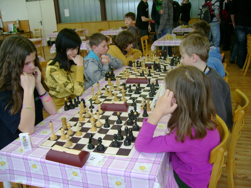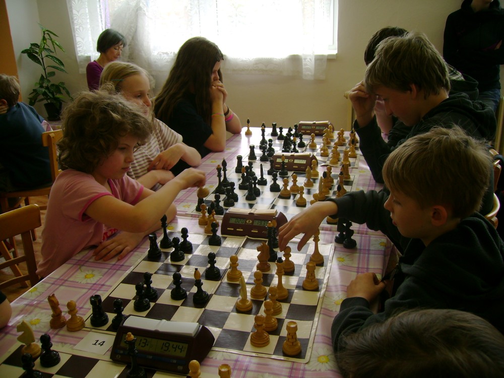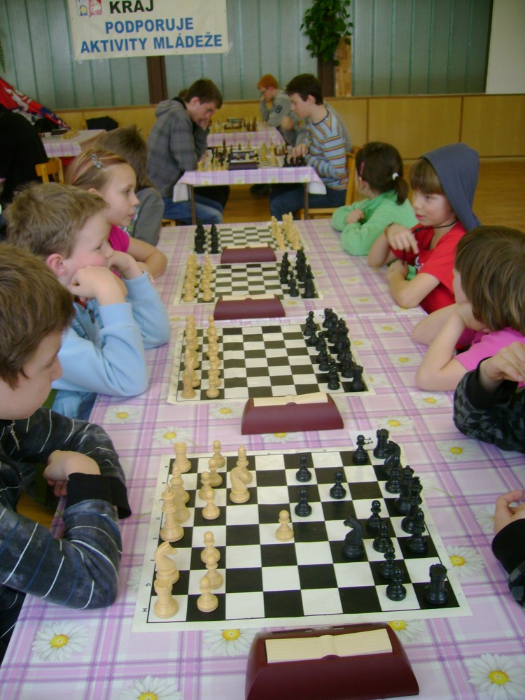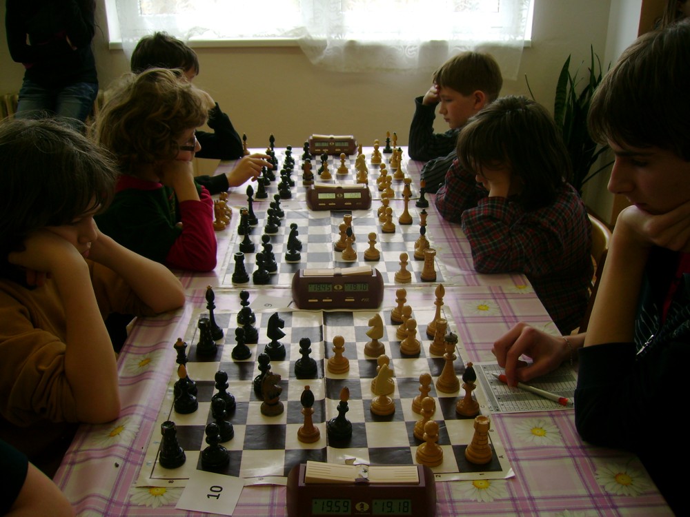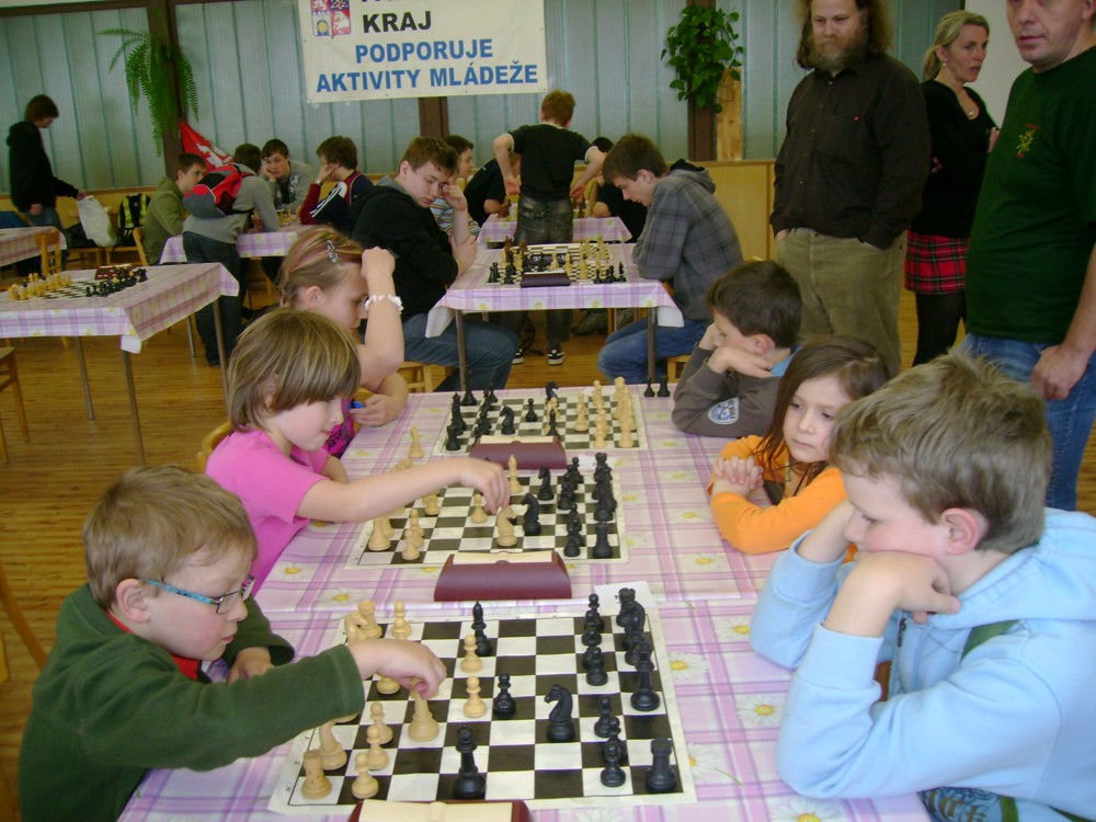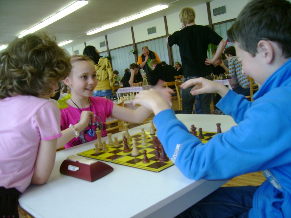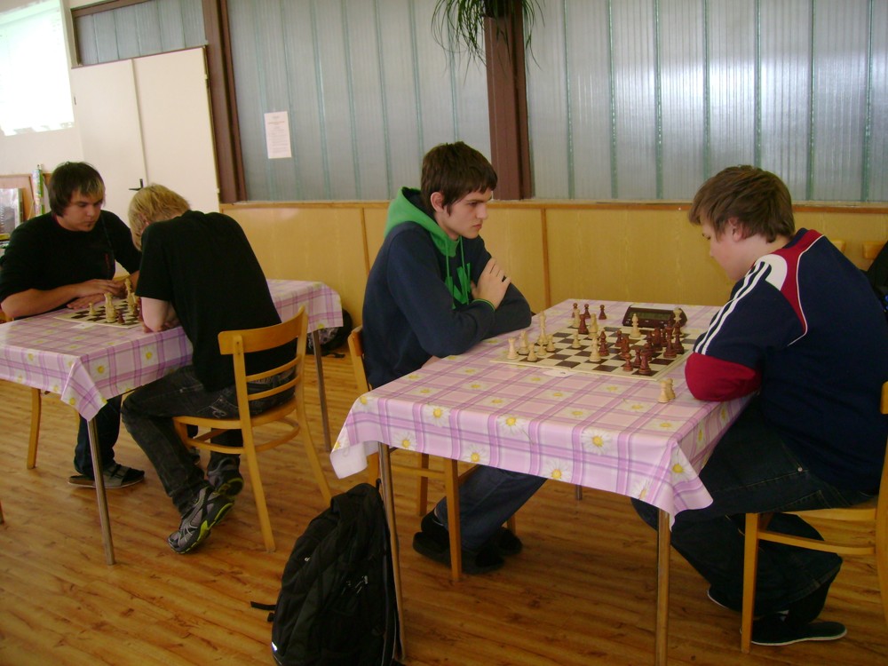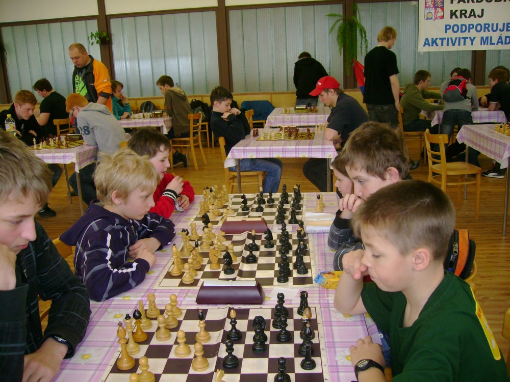 Kateřina Šmajzrová zas tak často nehraje; porážela slabší, půlila s trojkama; prohru si bohužel schovala do posledního kola na druhou šachovnici: o dvě hlavy menší Lukáš Pavlíček ukázal, že obětní Grecovu variantu má narozdíl od Katky nastudovanou. 4,5/7, 10. místo, 2. mezi dívkami, nejlepší z našich, ještě aby ne :-). Vít Holásek hrál svůj solidní standard, moc však nestíhal hrací tempo (ve třetím kole přehrál Dvořáka, ale nebyl schopen zrychlit a spadnul). 4,5/7, 13. místo, dejme tomu. Veronika Šmajzrová po slabším výsledku ze Třebové dala vzpomenout na Orlickou šachovnici. Dařilo se jí, bojovala proti mnohem větším klukům, blýskla se výhrou nad Lukášem Paukertem. 4,5/7, 14. místo, 3. mezi dívkami, v tomto případě rozhodně úspěch! Martin Paukert už nehrál ani nepamatuju, tady se po startu 1/3 zvedl, vyhrál pak třikrát v řadě, mj. nad Monikou Ryšavou a předstihl mnoho našich zkušenějších hráčů (včetně staršího bráchy). 4/7, 18. místo. Vašek Grundman pokazil první kolo proti Marušce Vaškové, pak to bylo dobré, škoda posledního kola. 4/7, 19. místo. K šachové knížce, kterou studoval, ve vlaku, přidal další, kterou vyhrál – a nikdo z hráčů před ním po ní nesáhl! Lukáš Paukert musel po prohře s Verunkou Šmajzrovou dohánět terén ze zadních pozic. 4/7, 21. místo, na Lukáše sotva průměr. Naše čtyřbodové uzavírá Jirka Píše, i on mohl chtít po úspěchu ve Třebové (postup do finále kat. H12) víc. 4/7, 22. místo.
