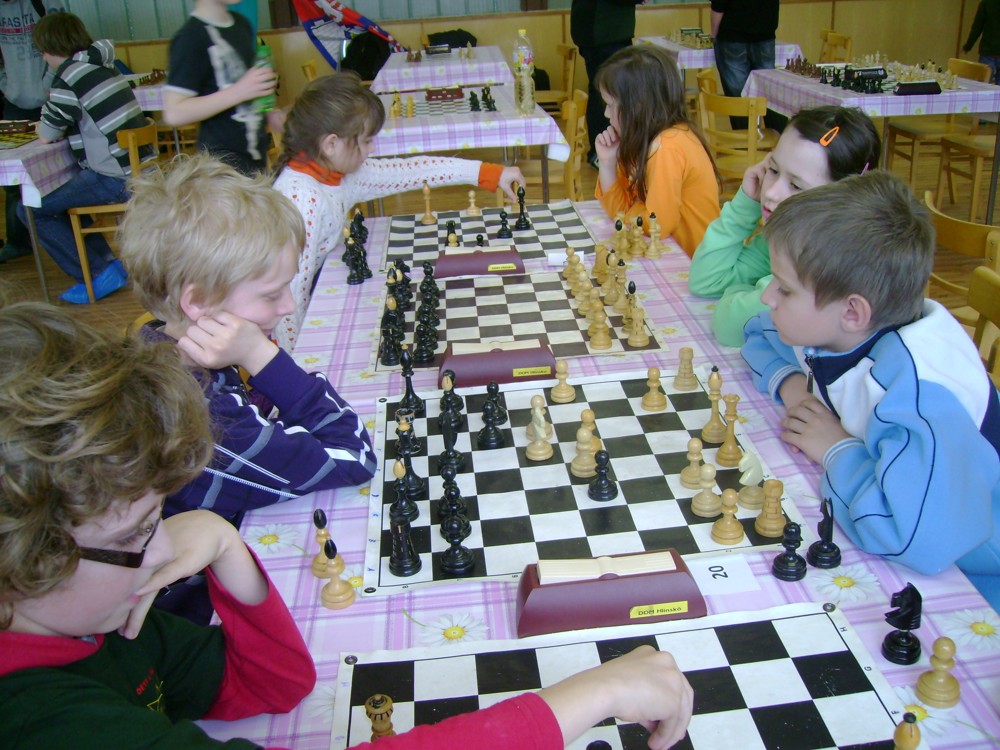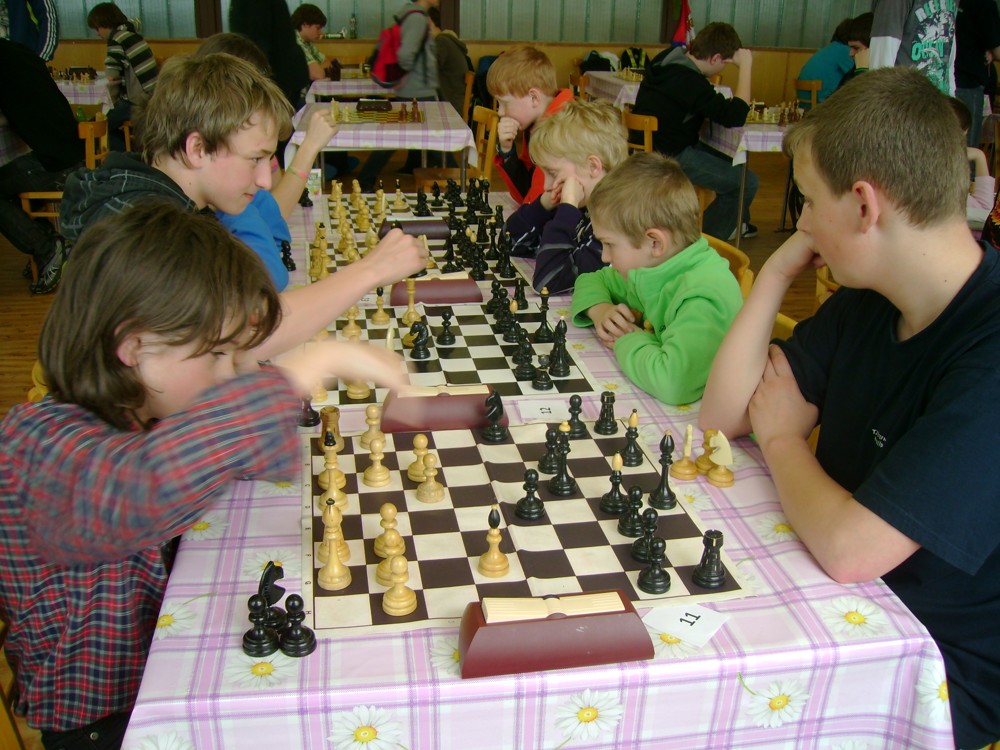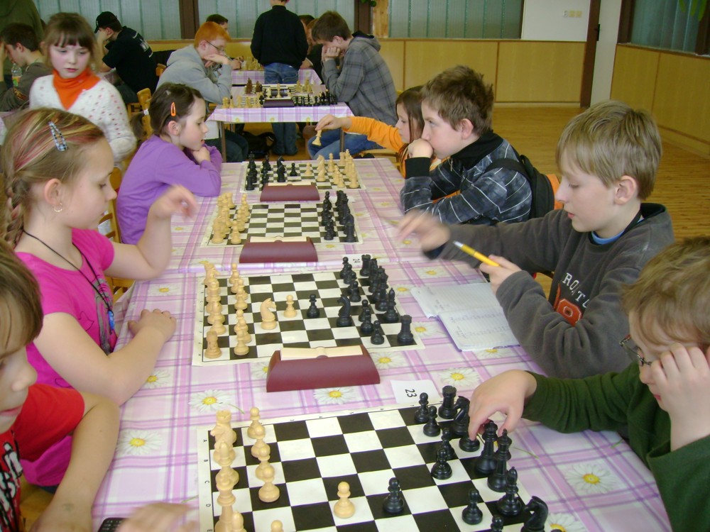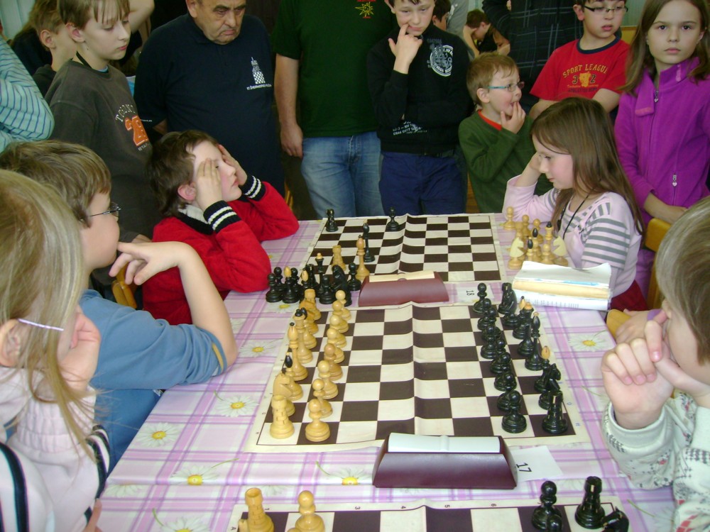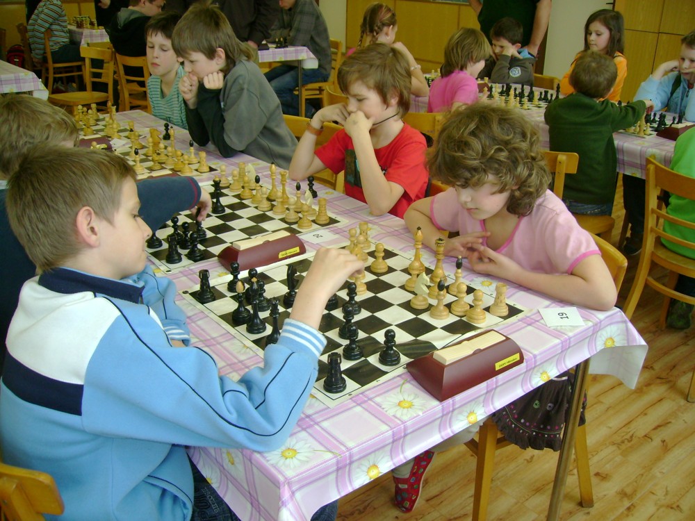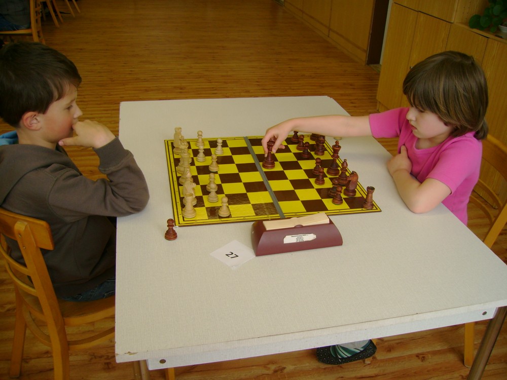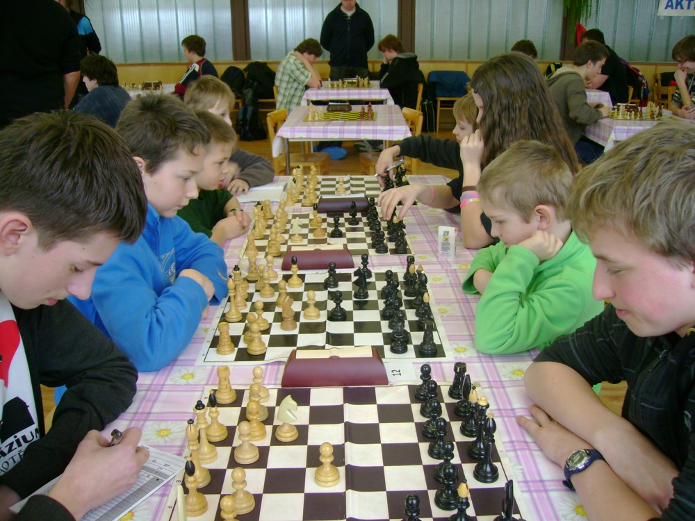 Kateřina Šmajzrová zas tak často nehraje; porážela slabší, půlila s trojkama; prohru si bohužel schovala do posledního kola na druhou šachovnici: o dvě hlavy menší Lukáš Pavlíček ukázal, že obětní Grecovu variantu má narozdíl od Katky nastudovanou. 4,5/7, 10. místo, 2. mezi dívkami, nejlepší z našich, ještě aby ne :-). Vít Holásek hrál svůj solidní standard, moc však nestíhal hrací tempo (ve třetím kole přehrál Dvořáka, ale nebyl schopen zrychlit a spadnul). 4,5/7, 13. místo, dejme tomu. Veronika Šmajzrová po slabším výsledku ze Třebové dala vzpomenout na Orlickou šachovnici. Dařilo se jí, bojovala proti mnohem větším klukům, blýskla se výhrou nad Lukášem Paukertem. 4,5/7, 14. místo, 3. mezi dívkami, v tomto případě rozhodně úspěch! Martin Paukert už nehrál ani nepamatuju, tady se po startu 1/3 zvedl, vyhrál pak třikrát v řadě, mj. nad Monikou Ryšavou a předstihl mnoho našich zkušenějších hráčů (včetně staršího bráchy). 4/7, 18. místo. Vašek Grundman pokazil první kolo proti Marušce Vaškové, pak to bylo dobré, škoda posledního kola. 4/7, 19. místo. K šachové knížce, kterou studoval, ve vlaku, přidal další, kterou vyhrál – a nikdo z hráčů před ním po ní nesáhl! Lukáš Paukert musel po prohře s Verunkou Šmajzrovou dohánět terén ze zadních pozic. 4/7, 21. místo, na Lukáše sotva průměr. Naše čtyřbodové uzavírá Jirka Píše, i on mohl chtít po úspěchu ve Třebové (postup do finále kat. H12) víc. 4/7, 22. místo.