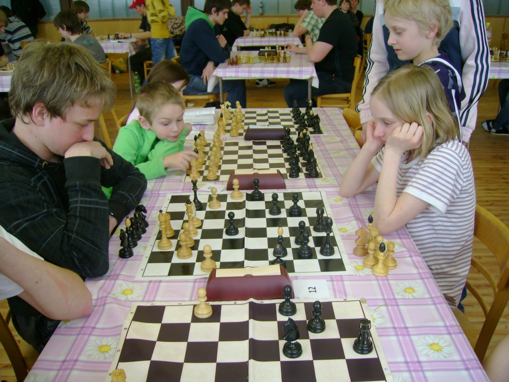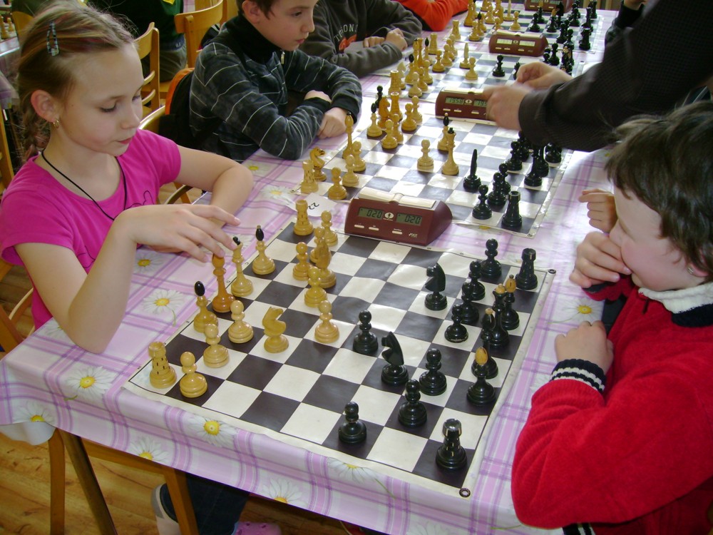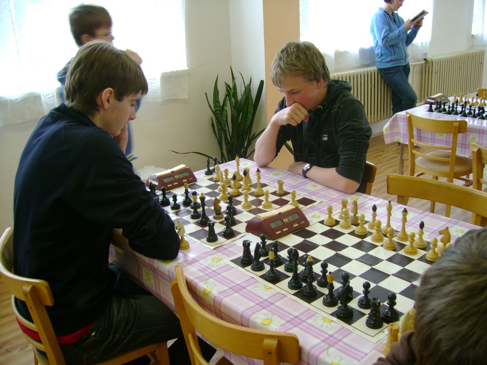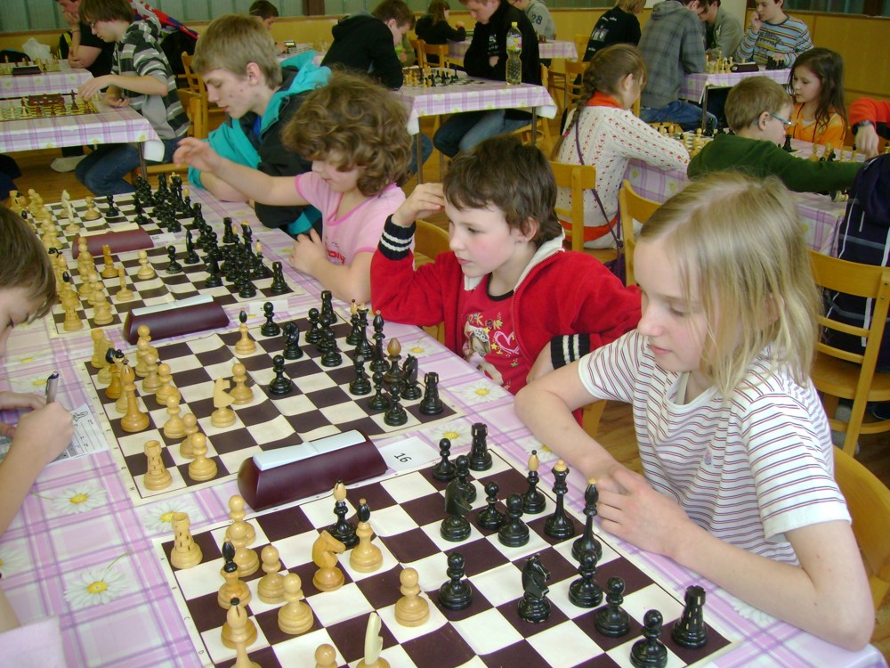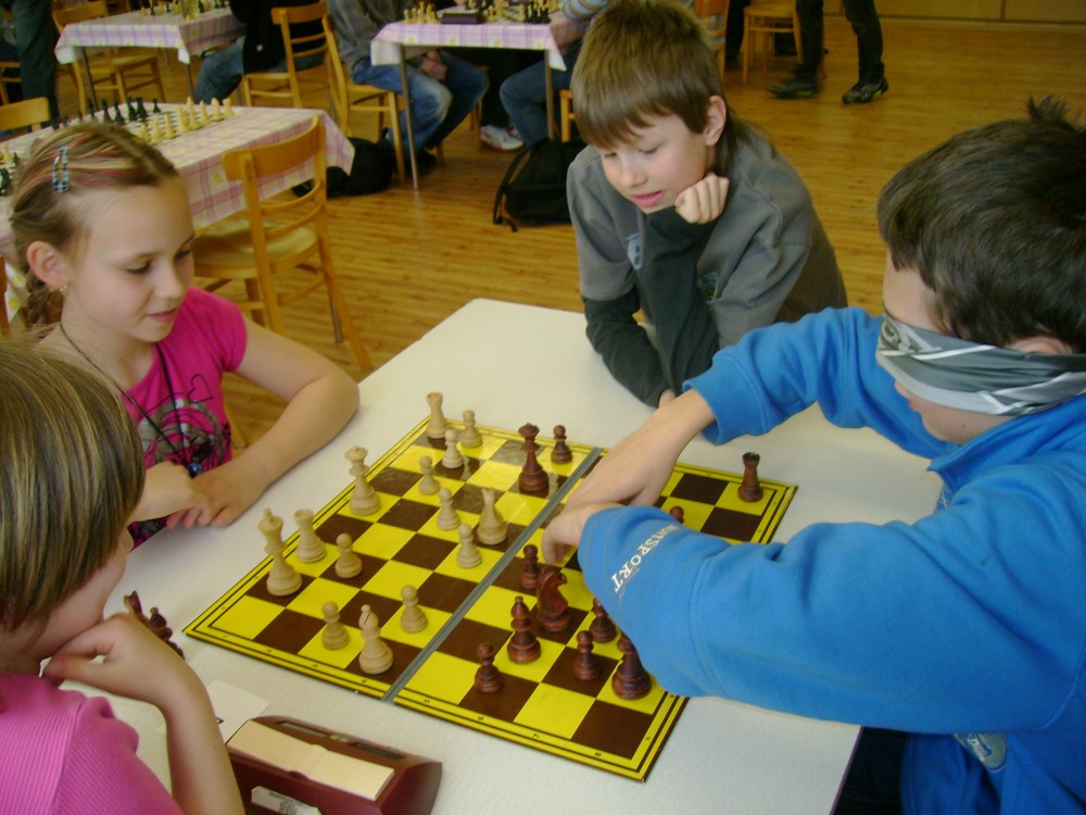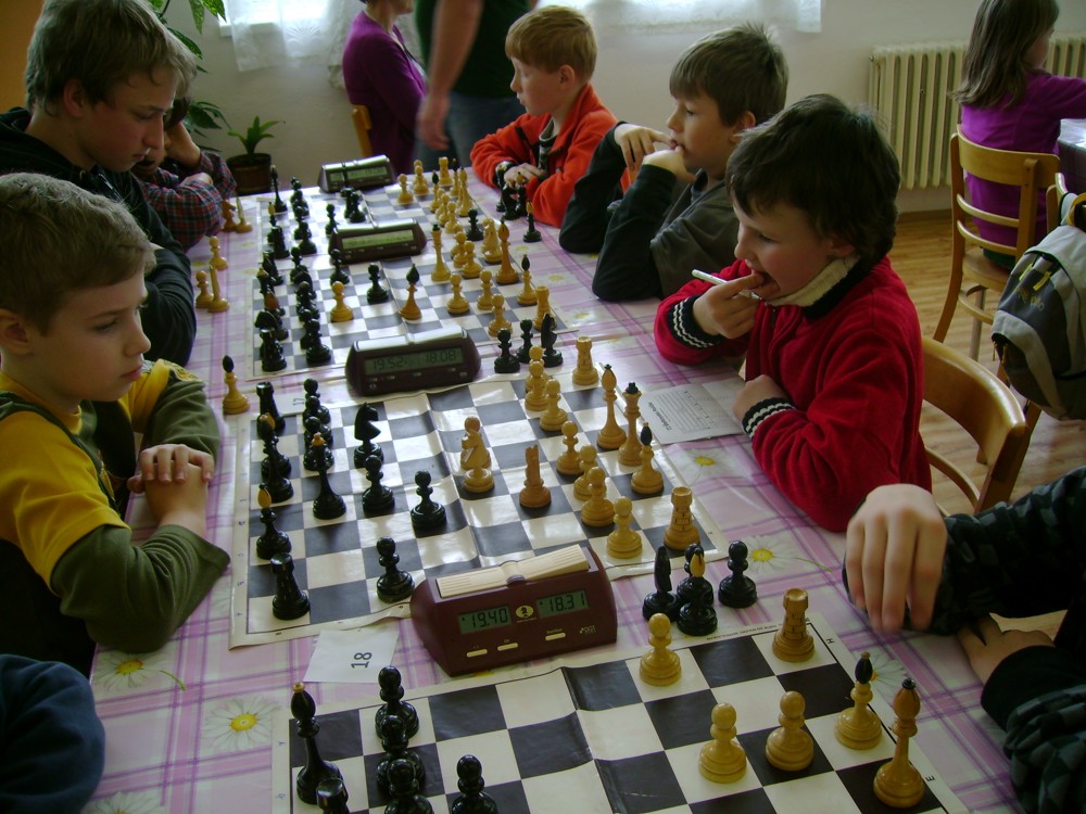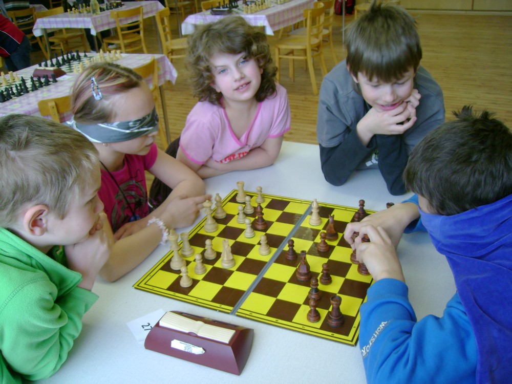 Kateřina Šmajzrová zas tak často nehraje; porážela slabší, půlila s trojkama; prohru si bohužel schovala do posledního kola na druhou šachovnici: o dvě hlavy menší Lukáš Pavlíček ukázal, že obětní Grecovu variantu má narozdíl od Katky nastudovanou. 4,5/7, 10. místo, 2. mezi dívkami, nejlepší z našich, ještě aby ne :-). Vít Holásek hrál svůj solidní standard, moc však nestíhal hrací tempo (ve třetím kole přehrál Dvořáka, ale nebyl schopen zrychlit a spadnul). 4,5/7, 13. místo, dejme tomu. Veronika Šmajzrová po slabším výsledku ze Třebové dala vzpomenout na Orlickou šachovnici. Dařilo se jí, bojovala proti mnohem větším klukům, blýskla se výhrou nad Lukášem Paukertem. 4,5/7, 14. místo, 3. mezi dívkami, v tomto případě rozhodně úspěch! Martin Paukert už nehrál ani nepamatuju, tady se po startu 1/3 zvedl, vyhrál pak třikrát v řadě, mj. nad Monikou Ryšavou a předstihl mnoho našich zkušenějších hráčů (včetně staršího bráchy). 4/7, 18. místo. Vašek Grundman pokazil první kolo proti Marušce Vaškové, pak to bylo dobré, škoda posledního kola. 4/7, 19. místo. K šachové knížce, kterou studoval, ve vlaku, přidal další, kterou vyhrál – a nikdo z hráčů před ním po ní nesáhl! Lukáš Paukert musel po prohře s Verunkou Šmajzrovou dohánět terén ze zadních pozic. 4/7, 21. místo, na Lukáše sotva průměr. Naše čtyřbodové uzavírá Jirka Píše, i on mohl chtít po úspěchu ve Třebové (postup do finále kat. H12) víc. 4/7, 22. místo.